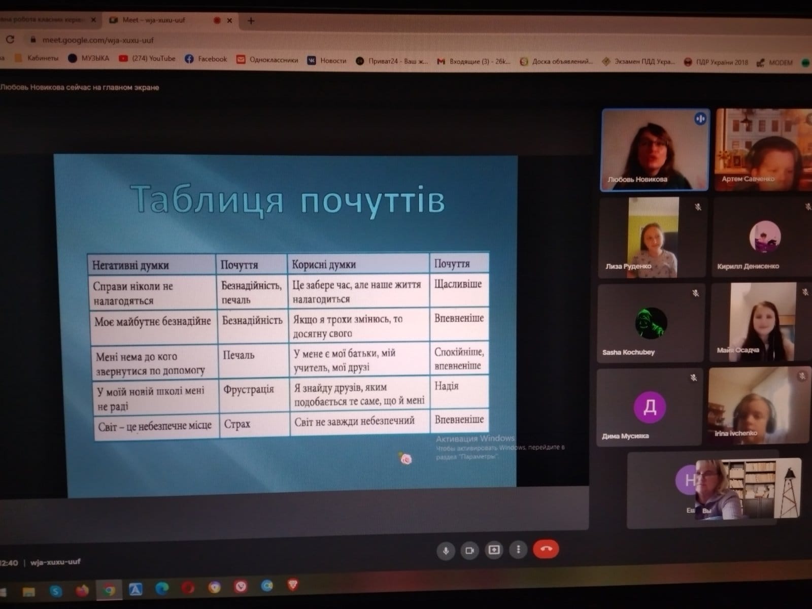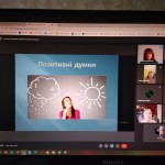 З метою формування стресостійкості, пошуку та розширення ресурсів особистості, створення умов для формування підтримки та стабілізації дітей для учнів 5-7 класів були проведені онлайн заняття “Простір твоїх почуттів”. Діти вчилися перетворювати негативні думки на позитивні, і таким чином налаштовувалися на позитивне майбутнє. Заняття пройшли у приємній невимушеній атмосфері.