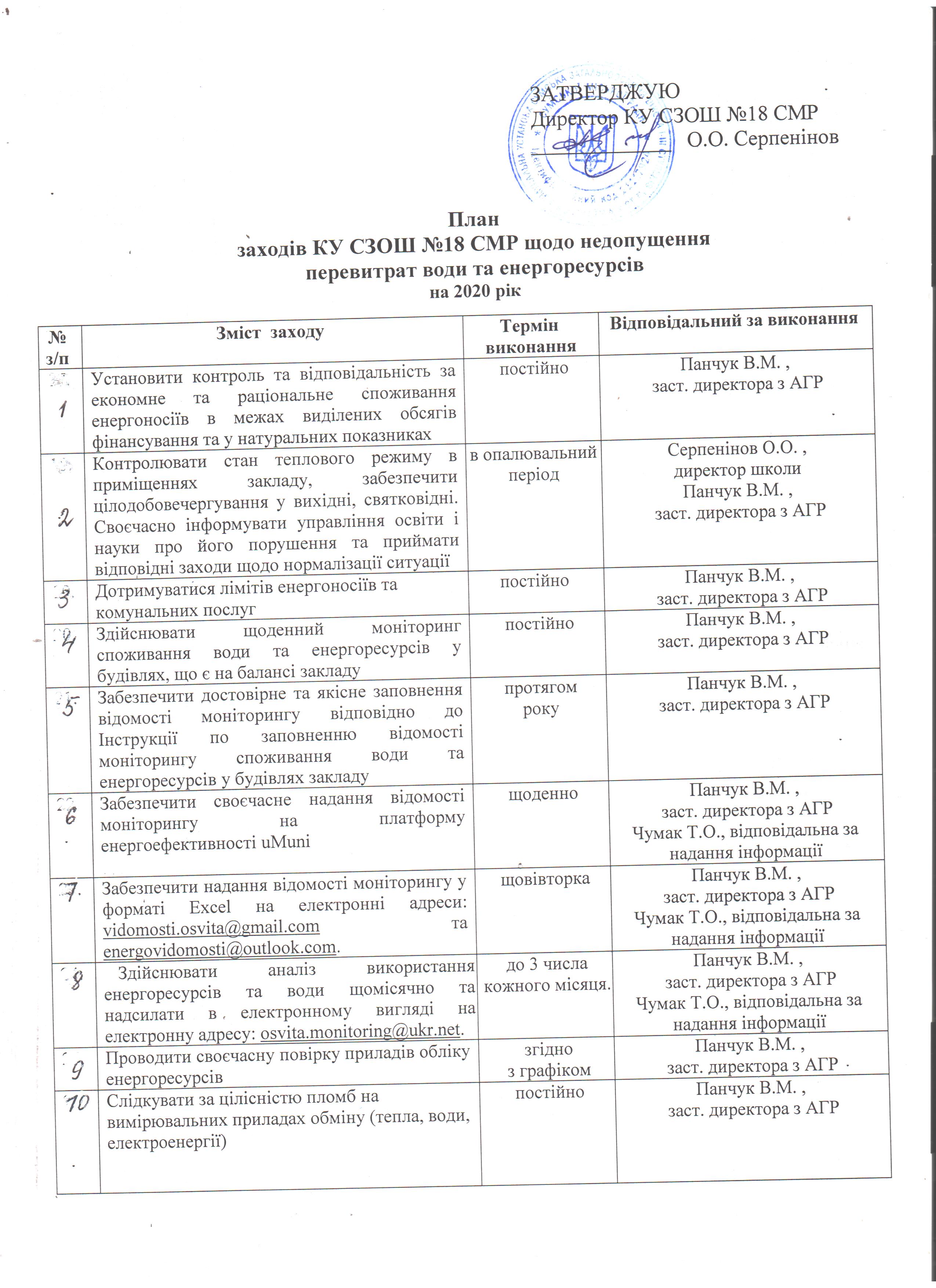 | 16 | Проводити роз’яснювальну роботу серед працівників щодо збереження та економного використання тепло-, водо-, енергоносіїв у закладі | протягомроку | Панчук В.М. ,заст. директора з АГР |