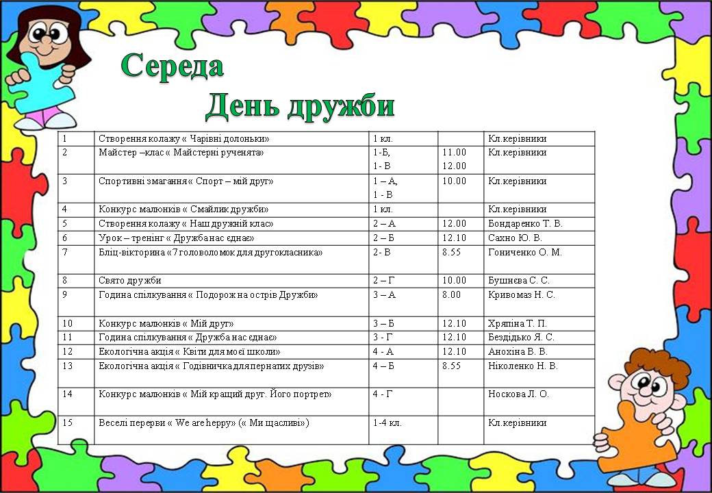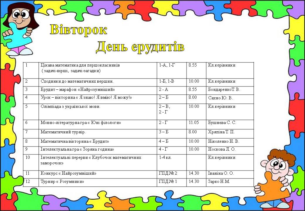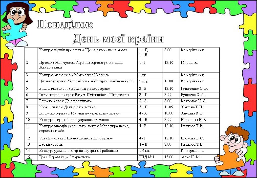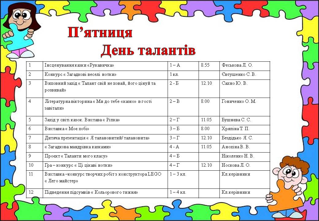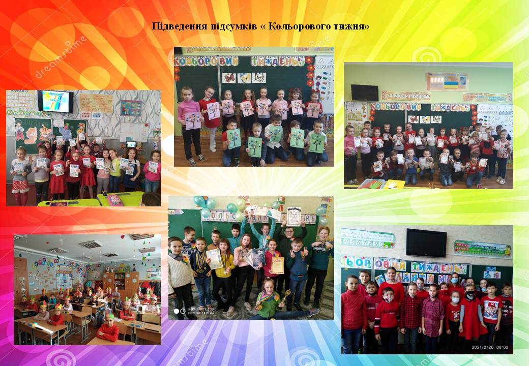 З 22 по 26 лютого 2021 у початкових класах проходив «Кольоровий тиждень». Кожен день тижня був присвячений певному кольору та мав своє направлення. Уроки, конкурси, змагання, виставки, які проходили в рамках тижня, розвивали творчість школярів, навчали їх бути спостережливими, кмітливими та креативними. Ентузіазм, творчий підхід учителів допомогли зробити тиждень початкової школи справжнім святом як для дітей, так і для дорослих. Кожен день «Кольорового тижня» пройшов на високому емоційному підйомі та позитиві. Вчитися, дійсно, цікаво і весело!