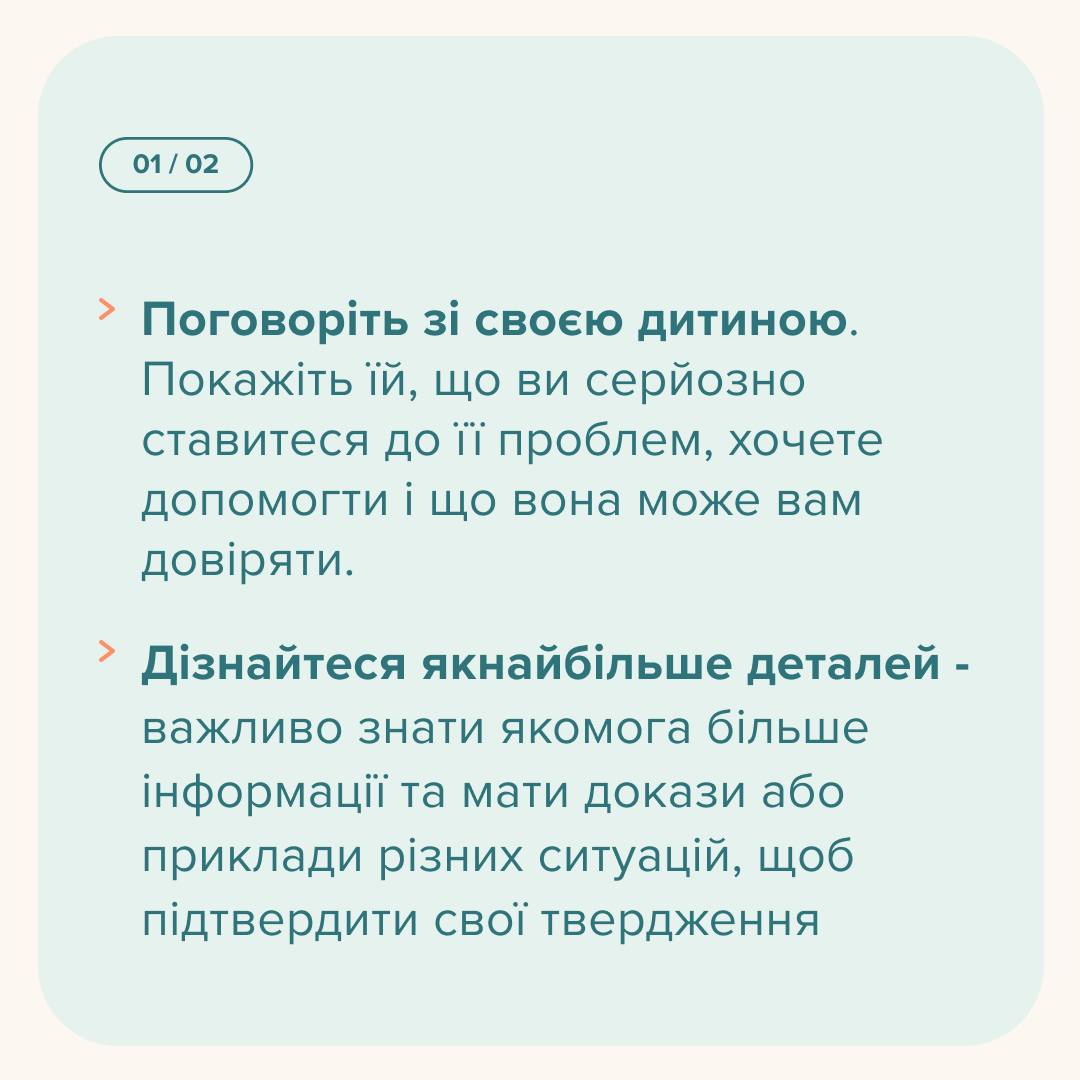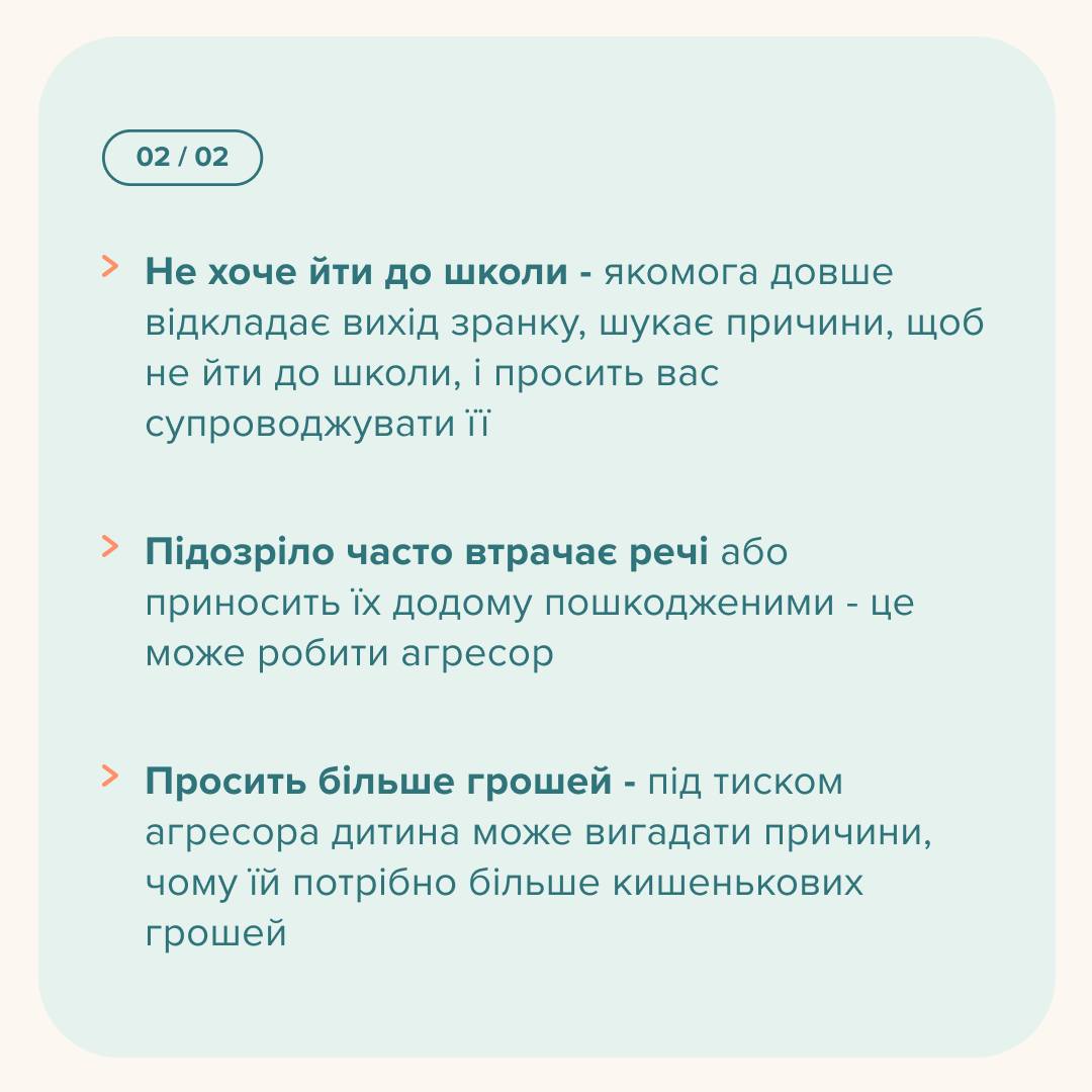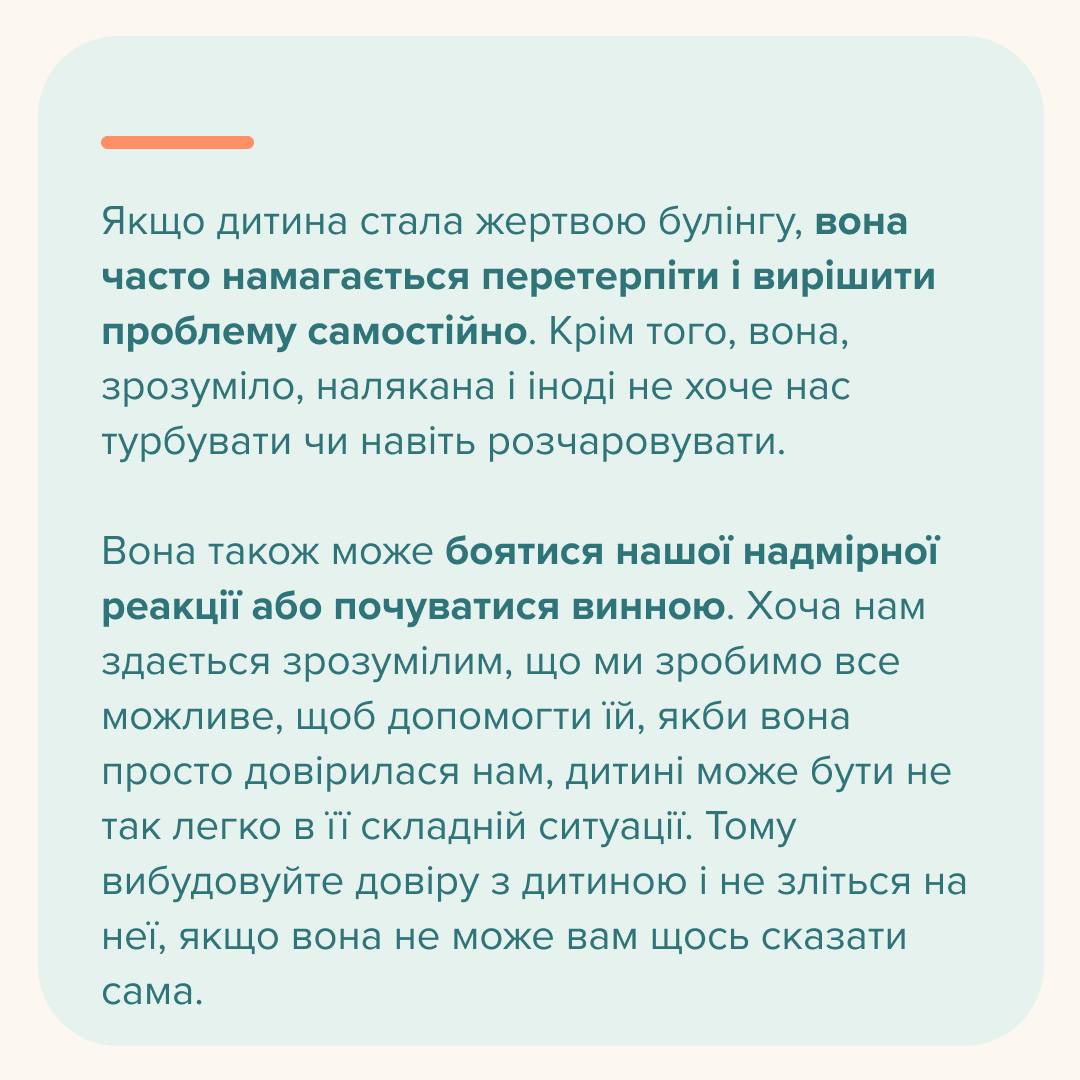Як дізнатися, що дитину цькують? Батьки, чия дитина зазнає булінгу, мають багато питань. Чому моя дитина? Чому вона не довірилась мені? Чи варто мені втручатися, чи я погіршу ситуацію? Як я можу їй допомогти? Ось кілька порад, як розпізнати ситуацію та впоратися з нею.